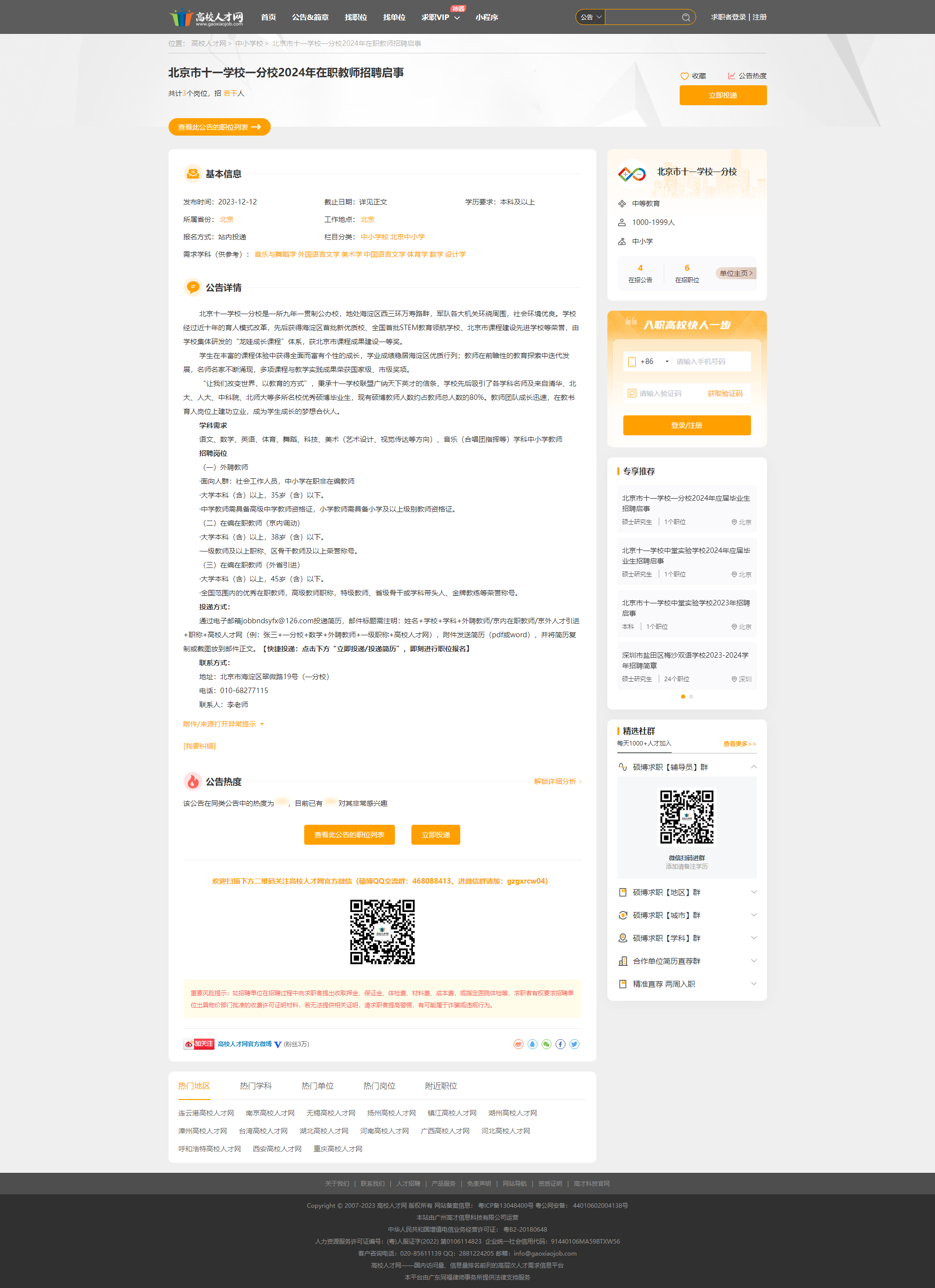 北京市十一学校一分校2024年在职教师招聘启事