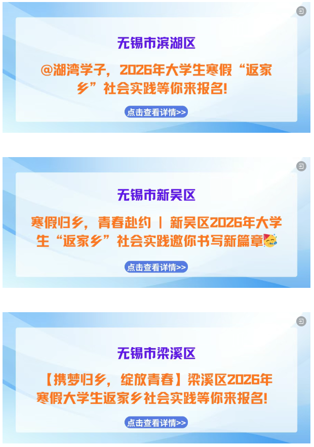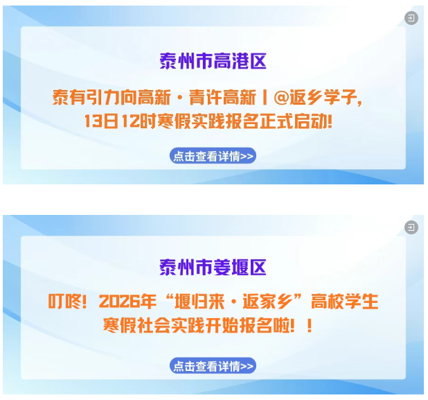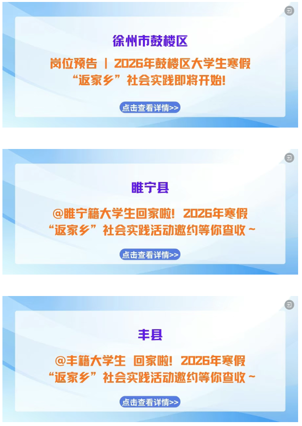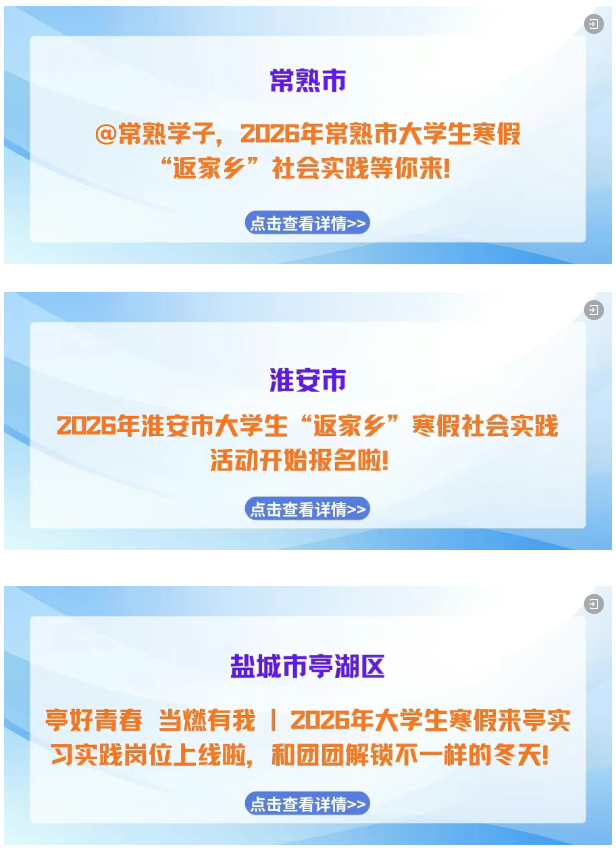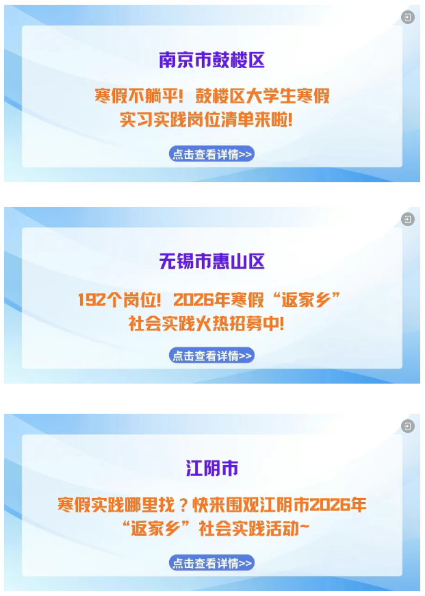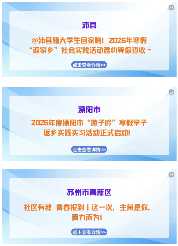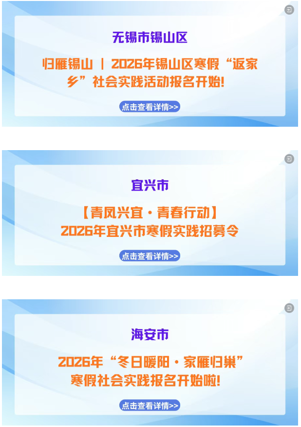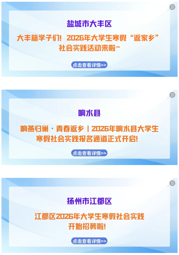 寒假如约而至,归乡步履不停! “返家乡” 社会实践活动已正式启航!带上学识与热忱,解锁专属实践岗位,用脚步丈量江苏的发展脉动,用实干为家乡建设注入青春动能,快来pick属于你的家乡实践之旅,这场青春与故土的“双向奔赴”正等你赴约!