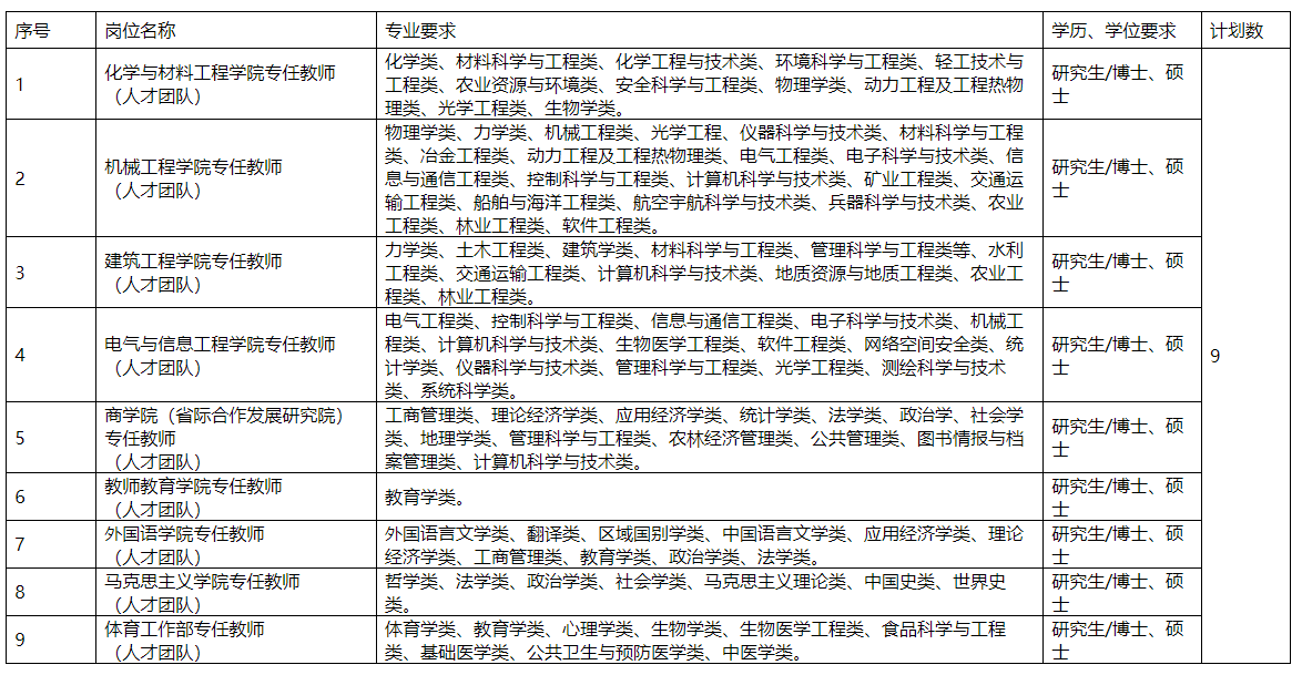 A、B、C、D类高层次人才(人才团队)共设9个岗位,计划引进9人(个);E类高层次人才共设9个岗位,计划引进20人;F类高层次人才共设9个岗位,计划引进50人;硕士研究生共设1个岗位,计划引进1人。具体岗位需求如下: