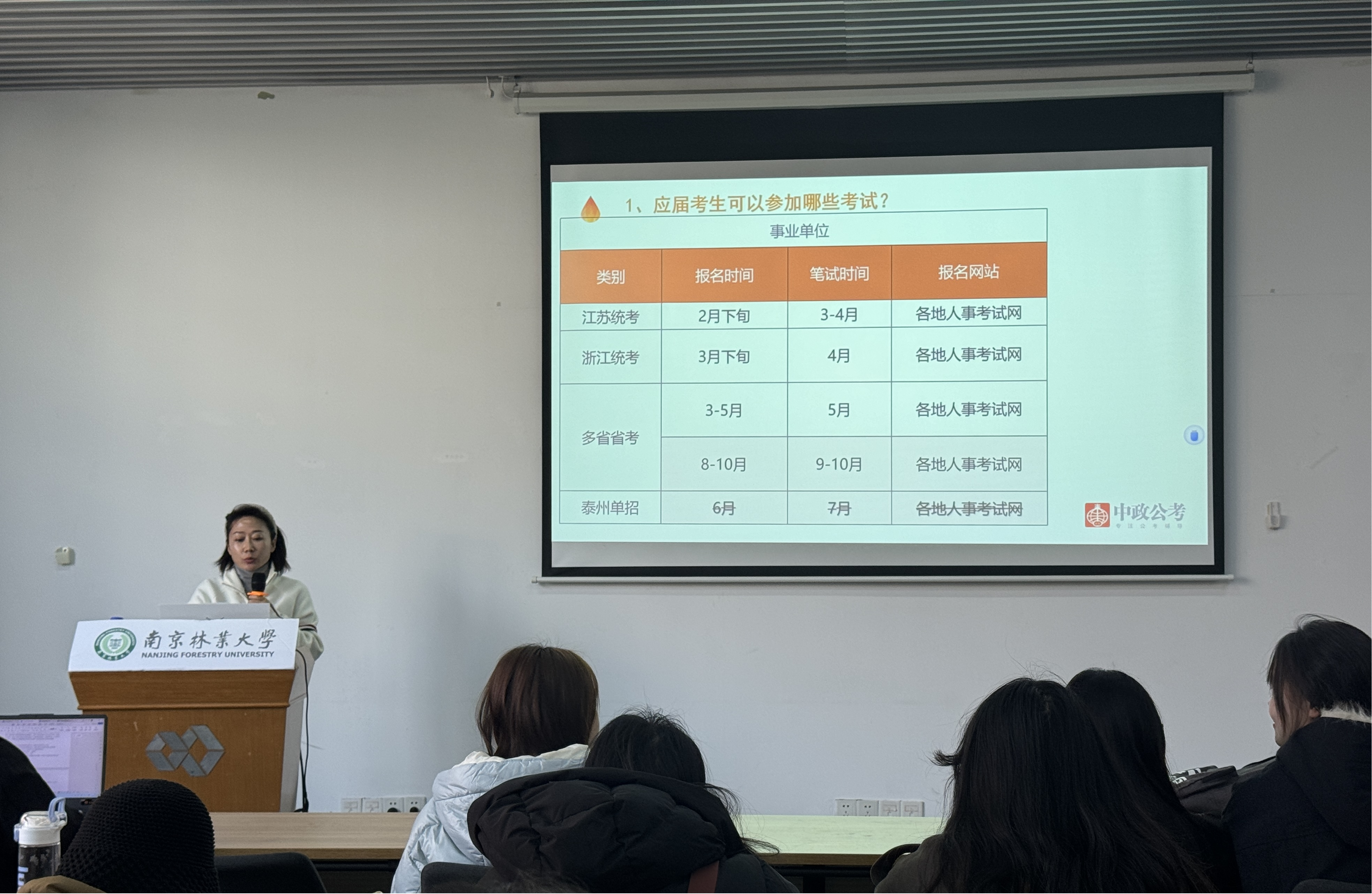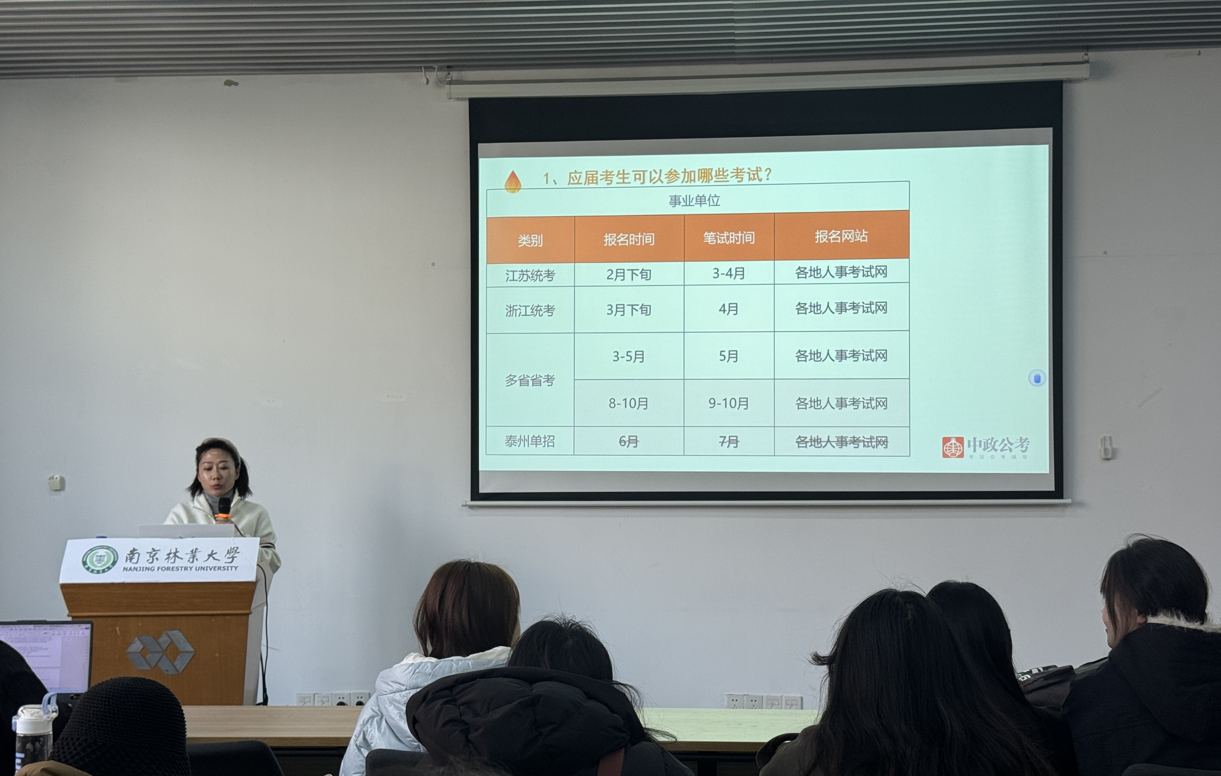 首先,王燚老师解读了各类公职考试的关键信息。针对应届毕业生,她详细介绍了国考、省考在报考地区、报名时间、笔试安排及官方平台等方面的注意事项,并结合江苏、浙江等地的事业单位统考、多省联考以及泰州单招等实例,深入讲解了相关报考政策与细则。
