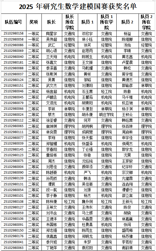 附:我校2025年“华为杯”第二十二届中国研究生数学建模竞赛获奖名单